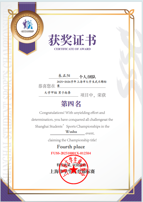 本次比赛设长拳、南拳、太极拳、刀术、剑术、枪术、棍术等多个传统与现代武术项目,竞争异常激烈。赛场上,我校选手动作矫健、刚柔并济,将中华武术的力与美展现得淋漓尽致。经过激烈角逐,孙晨雨同学在男子棍术项目中凭借出色的爆发力和控制力荣获第四名;朱正阳同学在男子南拳项目中以一套节奏鲜明、气势如虹的套路同样取得第四名的好成绩;此外,苏嘉怡和绳哲宇同学分别在女子长拳和男子长拳项目中发挥稳定、动作流畅,展现了良好的竞技状态。