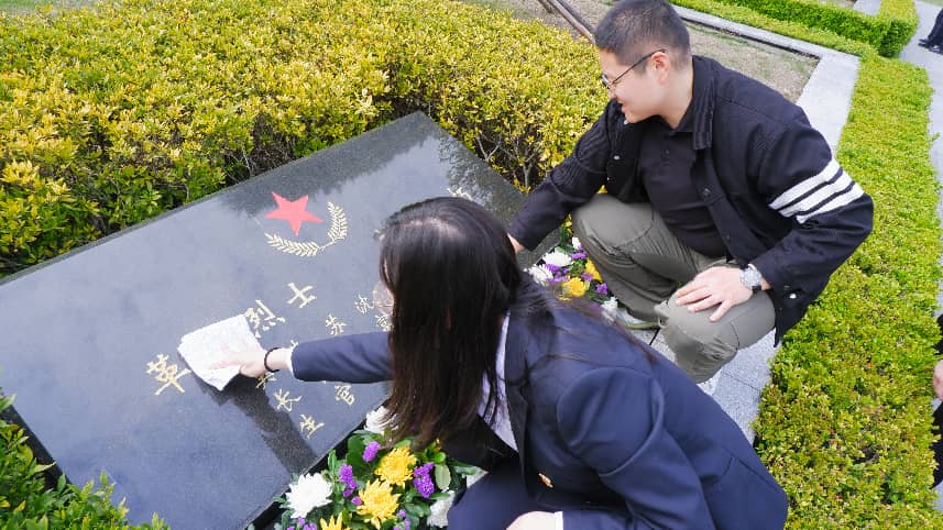 随后,大家手持白菊,依次缓步绕行纪念碑、瞻仰烈士墓区,向英烈敬献鲜花、鞠躬致敬,并俯身轻轻擦拭墓碑,以细致而庄重的行动表达对英烈的深切追思与崇高敬意。
